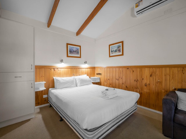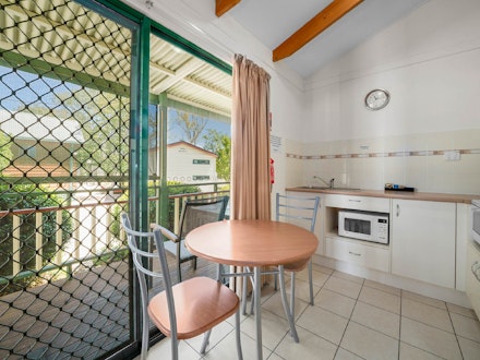 Ideal for couples or solo travellers, this bright studio features a queen bed, private ensuite and air-conditioned comfort. The kitchenette includes a microwave, stovetop, toaster and kettle for easy meal prep. With linen supplied and a dining table for two, it’s a cosy and convenient option for short stays in Albury.