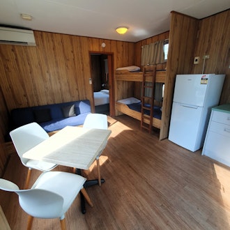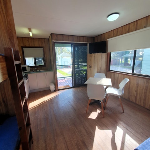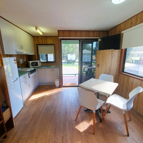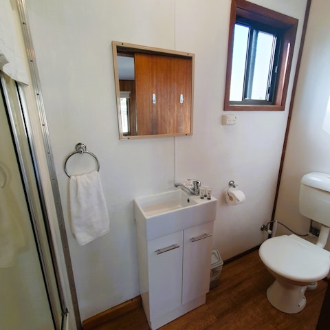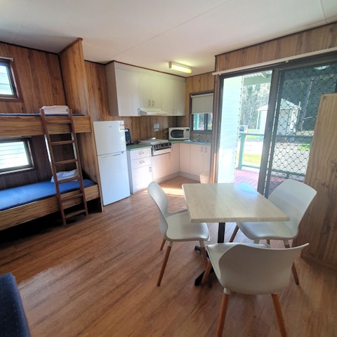 Budget cabin with Queen bed, ensuite with shower, basin & toilet, combined kitchen/dining/lounge area, double bunk in lounge area (linen not inc).