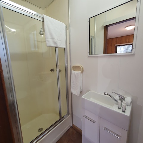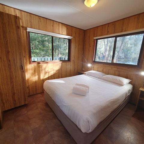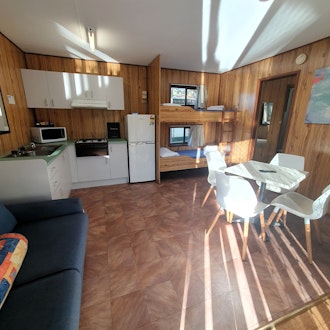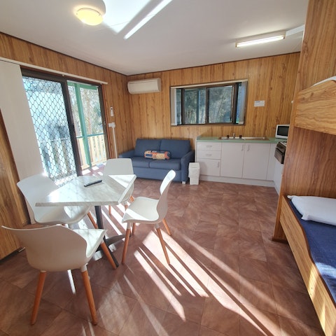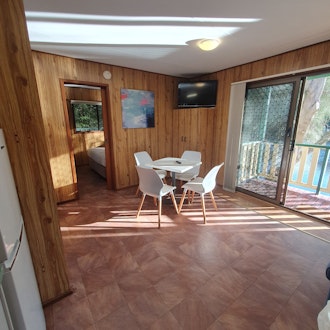 Ensuite cabin K9 suitable for pets. One bedroom cabin - pet friendly Bedroom has Queen bed. Kitchen with all cooking facilities, microwave, fridge/freezer. Table & chairs, lounge, TV, set of bunks. Shower, toilet and hand basin