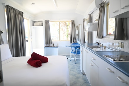 Fully self contained cabin featuring 1x double bed, TV, ensuite bathroom with corner spa bath, kitchenette, air-conditioning, microwave, tea and coffee making facilities, complimentary internet and car parking directly out front. Suitable for a maximum of 2 guests. Bedding linen, pillows and bath towels included.
