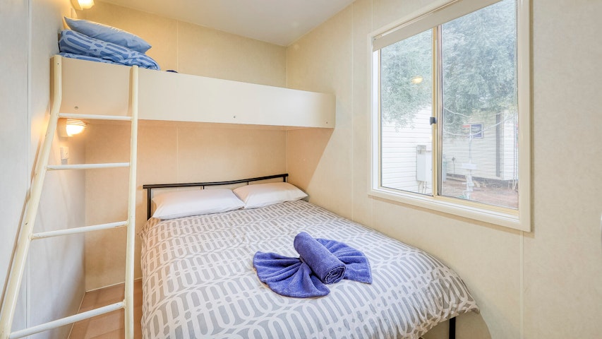 Perfect for those that enjoy a little more space and a bit more privacy. Open plan living area. Two private bedrooms. One with a double bed and one with a lodge bunk bed, double on bottom with a single on top.
