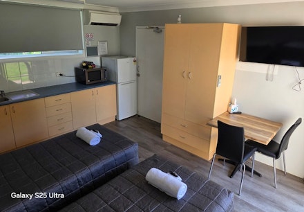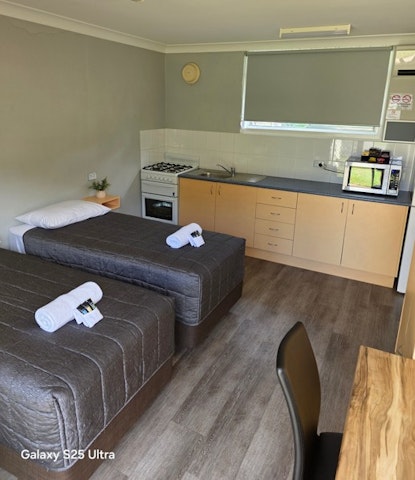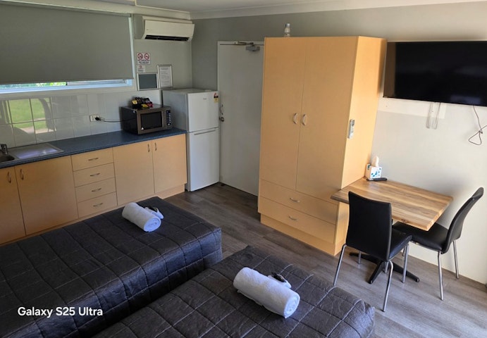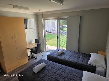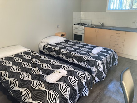 2 single beds Reverse cycle air-conditioning Full Kitchen Fridge/freezer, Microwave & toaster Flat screen TV All linen provided NO BATHROOM, THIS ROOM IS LOCATED CLOSE TO AMENITIES BLOCK