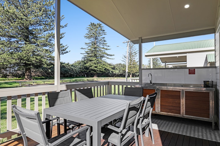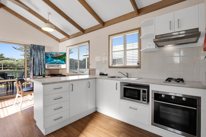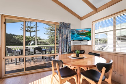 Ideal family cabin, with queen bed in main room and 3 singles (bunk style) in 2nd room. Fully self contained kitchen, lounge and dining with reverse cycle air-con. Fabulous outdoor eating area with private BBQ. Bathrooms has either a double shower or shower over bath, plus vanity & toilet.