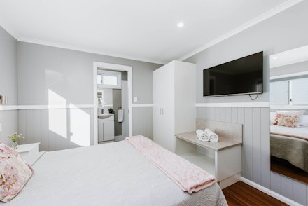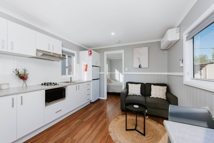 Villa 1 Bedroom Cabin has a queen bed in bedroom with TV, bathroom, a fully self contained kitchen, lounge/dining area, TV, aircon and verandah.