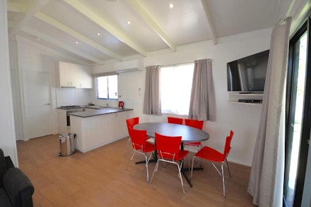 This cabin offers a spacious and comfortable stay with a view of the river, featuring two bedrooms separate from the main living and dining area. The master bedroom has a queen bed, while the second bedroom has two sets of bunk beds. All beds come with sheets, doonas, pillows, and towels. The kitchen is fully equipped with a microwave, full oven, fridge, crockery, cutlery, saucepans, kettle, and toaster. Additionally, the cabin includes a sofa, dining table, and chairs.