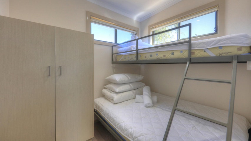 These spacious villas have incredible views over Lake Mulwala and direct access to our amazing foreshore. Features: Sleeps 8 guests. Queen bed in the main bedroom and one set of tri-bunks in the second and third bedroom (double bed with single overhead bunk) Spacious bathroom and separate toilet. Linen supplied. Modern open plan kitchen with full fridge, oven, gas cooktop and microwave. Spacious dining and lounge area, split system air conditioner, flat screen TV, DVD player and a deck with outdoor setting. *Photos are indicative only, decor and furniture may vary.