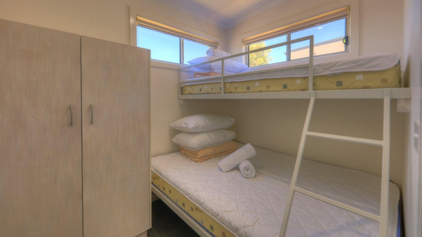 Magnificent three bedroom Pool Villa. Features: Sleeps 8 guests. Queen bed in the main bedroom, tri-bunk in second and third bedrooms (single over doubles) open plan living, self-contained kitchen with dishwasher and large fridge. Linen included, spacious bathroom, and a generous deck overlooking the resort pool. Air-conditioned, TV and DVD player. *Photos are indicative, decor and furniture may vary.