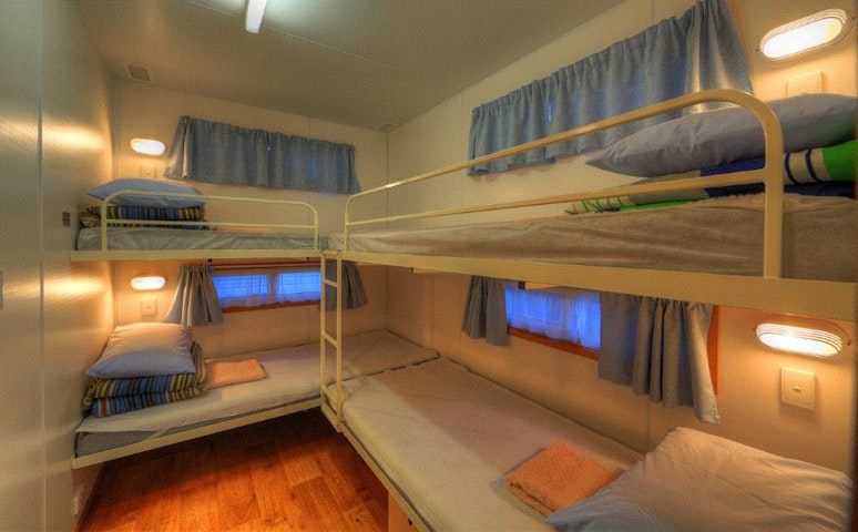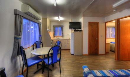 Two bedroom cabin with 1 x Queen bed and 2 x Bunk Beds and built in wardrobes. Combined living/dining area with kitchen, tv, air conditioning and covered deck.
