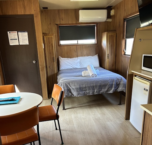 Older style cabin, open plan with double bed and bunk bed opposite ensuite. Main bed only has linen supplied. Fully equipped kitchenette, TV and A/C. Pets allowed inside (Extra charge applies). Can sleep 4 persons. Top bunk suitable for children only. Extra charge for pets.