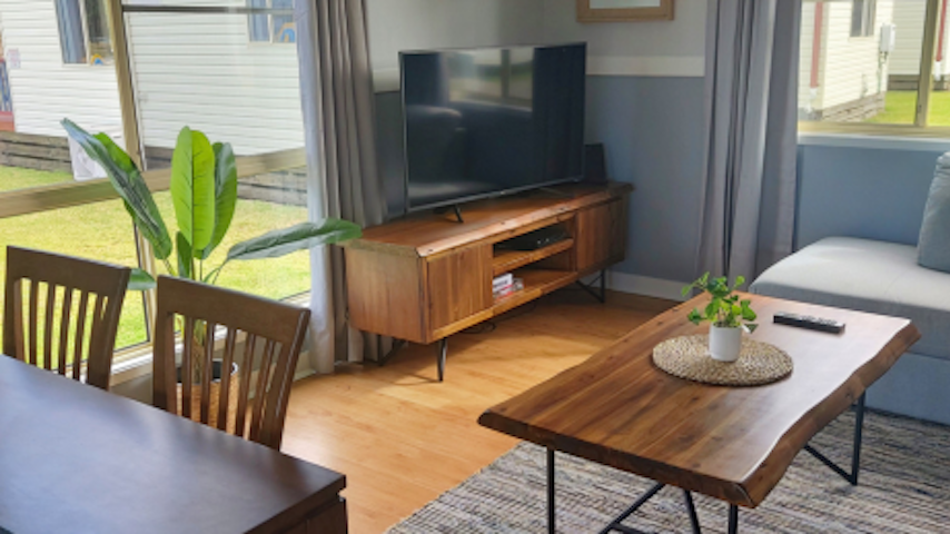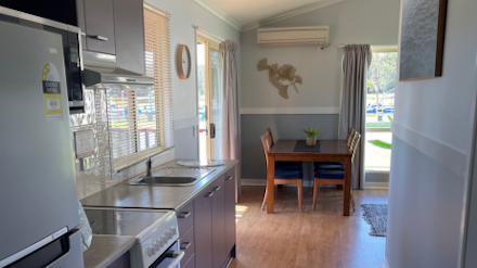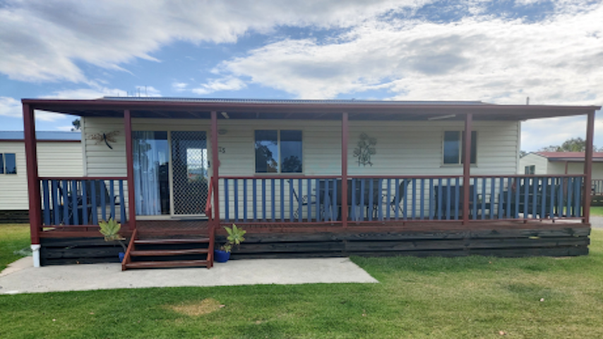 It is a large 2 bedroom cabin that is ideal for families. It is situated on the prime corner position of the park and has a large verandah, perfect for outdoor dining, overlooking the front lake.