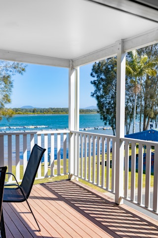 Deluxe Riverfront Cabin that accommodates up to 2 people. Situated 2.5 metres off the ground overlooking the Nambucca River, it features a queen bed, deck with river view, reverse cycle airconditioning and parking space for a car or boat at ground level.