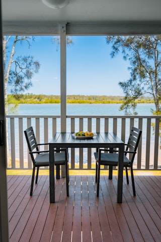 Step out through the double glass sliding doors onto the deck to see panoramic views of the river and a 3 piece outdoor dining setting for entertaining. There is also a covered parking space beneath the cabin and shared stairs leading to the front door.