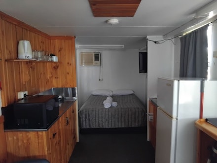 Budget friendly Cabins offering a queen bed and a single. No stove top available but plenty of appliances such as air fryer, 2 burner portable hot plate, saucepans, electric fry pan, microwave, utensils etc. Reverse-cycle air conditioner, TV. Outside, private ensuite.