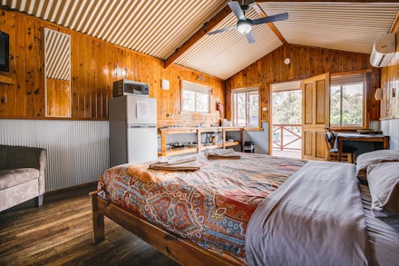 Our double deluxe cabin features a queen bed and full cooking facilities, including a microwave and full-size fridge. Enjoy the comfort of reverse cycle air conditioning, and rest assured that linen is provided.