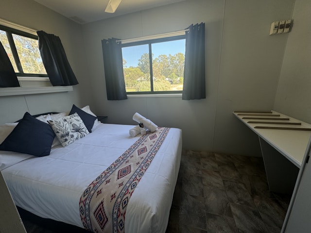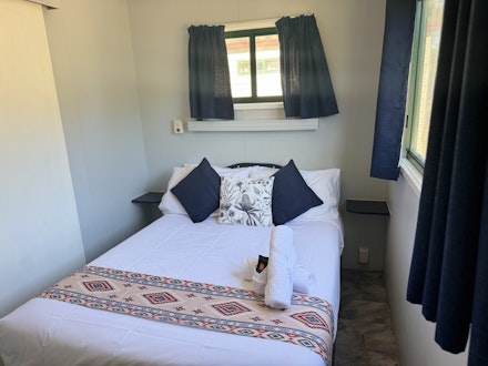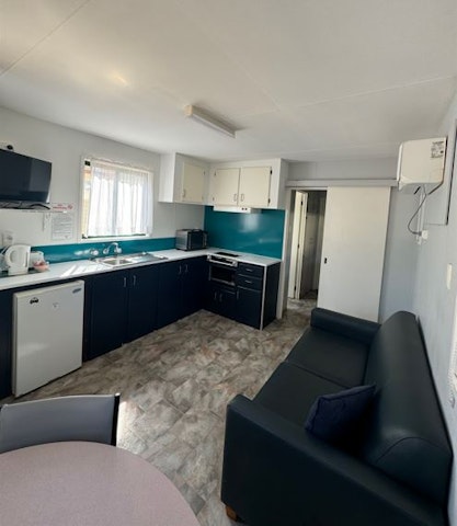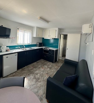 Family Ensuite Cabin (Ideal for Larger Families) This cabin includes a private room with a double bed, three single bunk beds, a sofa lounge/bed, a TV, a fully equipped kitchen, a compact fridge, and a private bathroom with a toilet and shower.