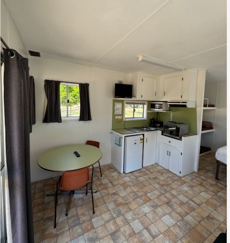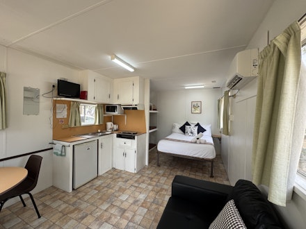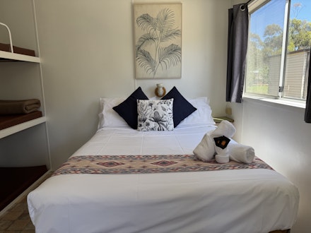 This cabin features a double bed, three single bunk beds, a kitchenette, a small TV, and reverse-cycle air conditioning.
