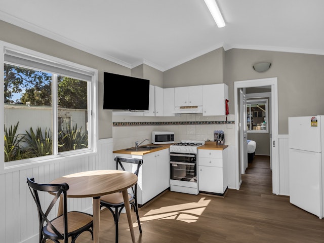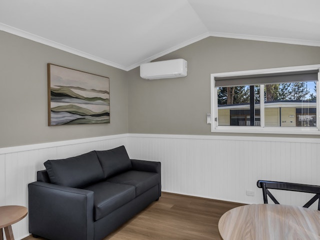 This one-bedroom cabin sleeps up to 2 guests with one double bed. It features a private bathroom with a shower, toilet, and complimentary toiletries. Linen and towels are provided for your comfort. The cabin includes a cozy living area with a sofa, dining space, TV, fan, and heating for year-round comfort. A kitchenette with a microwave, toaster, and kettle allows for easy meal preparation.