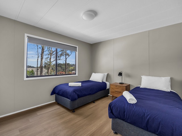 This two-bedroom cabin sleeps up to 4 guests with one queen bed and two single beds. It includes a private bathroom with a shower, toilet, and complimentary toiletries. Linen and towels are provided for all beds. The cabin features a comfortable living area with a sofa, TV, fan, and heating for your convenience.