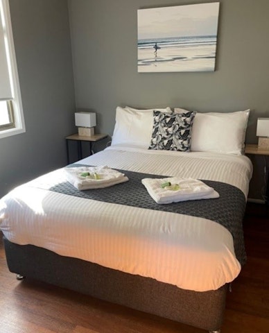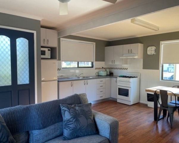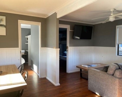 Perfect for families, this standard two-bedroom cabin sleeps up to four guests with a queen bed and bunk bed. Enjoy the convenience of a full kitchen with gas oven, private ensuite, dining area, TV, and reverse-cycle air conditioning—all within easy reach of park facilities and the beach.