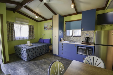 Featuring a double bed made up with fresh linen, our Double Ensuite Cabins are a comfy and convenient choice for couples or solo travellers. Each cabin has a fully equipped kitchen with crockery, cutlery and cooking facilities, so you can prepare meals with ease.