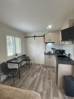 Perfect for a couple or one person, this new, modern, and compact cottage offers everything needed for a comfortable stay. It features a double bed, dining table, well-equipped kitchen, and ensuite bathroom. Located in a quiet area inside the park, the cabin provides welcome tea, coffee, sugar, and milk.