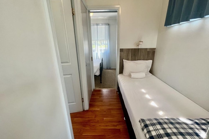 This open-plan living area includes a kitchen, sofa, dining space, TV, and air conditioning. There’s a sleeping alcove with a bunk or single bed, while the main bedroom has a double bed. The separate bathroom features a shower, toilet, and basin.
