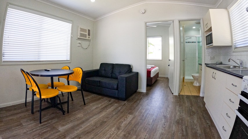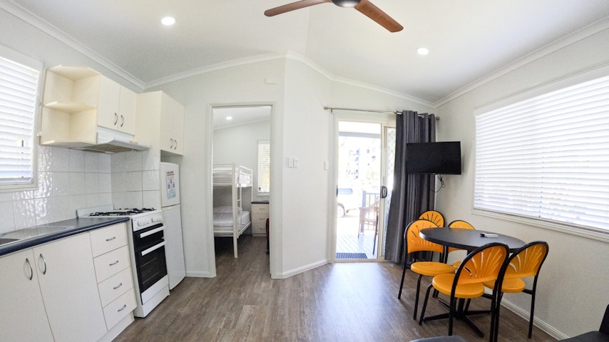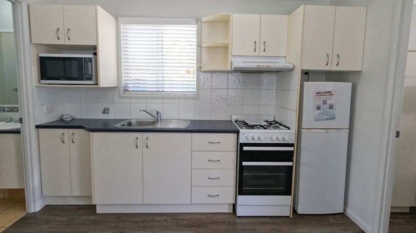 Alex Beach Cabins 2 bedroom villa includes a queen bed, single bed, bunk bed. Fully equipped kitchen. Lounge/dining area. 2 door fridge, full stove, microwave. LED flat screen TV, hairdryer, ceiling fans and reverse cycle air conditioning, covered verandah, linen, blankets & bath towels supplied. BYO beach towels.