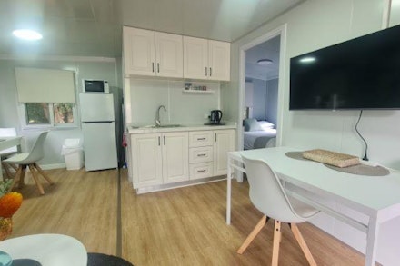 The cabin is air conditioned and includes a welcoming lounge area and a Smart Full HD television for your entertainment. The well-equipped kitchenette provides everything you need for easy meal preparation, including an air fryer, electric frying pan, microwave, and large refrigerator.