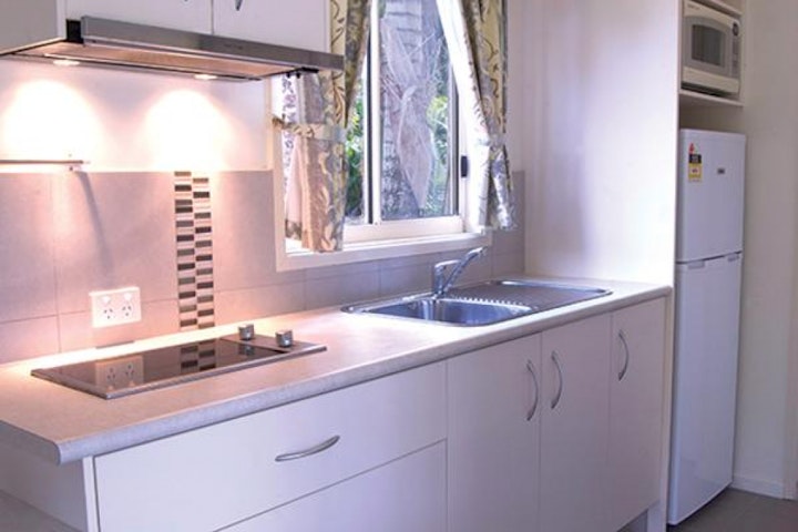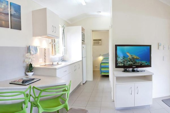 The Rainforest Chalets are thoughtfully designed exclusively for couples, offering a private and romantic retreat. These one-bedroom, self-contained units feature a queen bed in a separate bedroom, providing comfort and privacy from the living area.