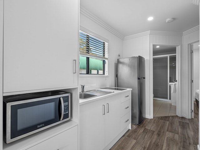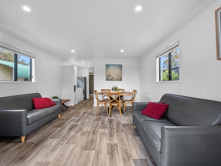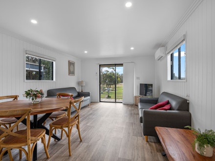 Spacious and modern, this two-bedroom villa sleeps up to seven with a queen bed, tri-bunk, and fold-out futon — ideal for families. The open-plan layout includes a full kitchen, dining area, TV, and air conditioning. A private bathroom and heating ensure year-round comfort. Step outside to a furnished outdoor space perfect for relaxed meals. It’s a welcoming, self-contained base for your next peaceful getaway.