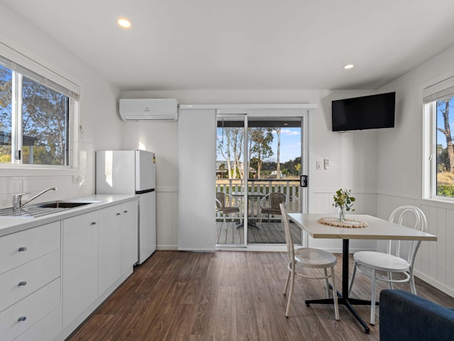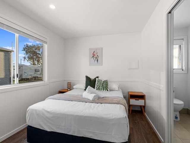Ideal for couples or solo travellers, this studio cabin sleeps up to three with a queen and single bed. The open-plan layout includes a dining area, TV, and compact kitchenette with all essentials. Enjoy year-round comfort with air-conditioning, and relax on the private balcony with outdoor seating. With a private bathroom, linen provided, and peaceful surrounds, it’s a comfortable base for short stays or stopovers.