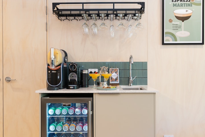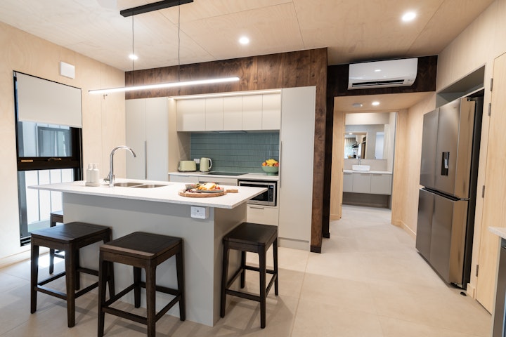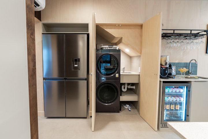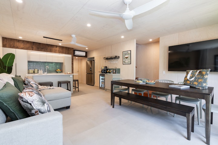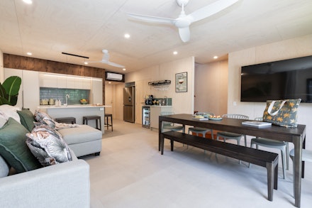 On the ground floor, each Penthouse features a secure carport with space for one large or two smaller vehicles.Inside, the fully equipped kitchen flows seamlessly into an open-plan dining and lounge area, complete with a sofa bed for extra guests. A dedicated cocktail bar provides the perfect spot for evening drinks, while the dining space is ideal for shared family meals. The lower level also includes a king bedroom with private ensuite, plus a laundry with washer and dryer neatly tucked under the staircase.
