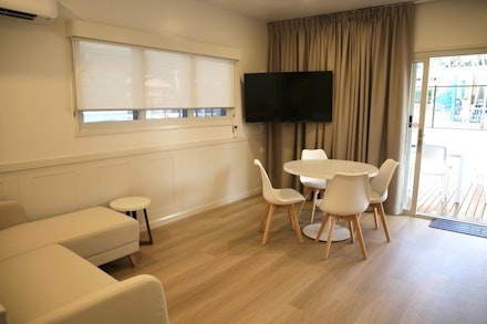 Accommodating 5 people, our Poolside Paradise Accessible Two-Bedroom Villa is located directly adjacent to the pool and splash pad. Accessed via a wheelchair friendly ramp to the front deck this Villa is suited to a family or group of friends.