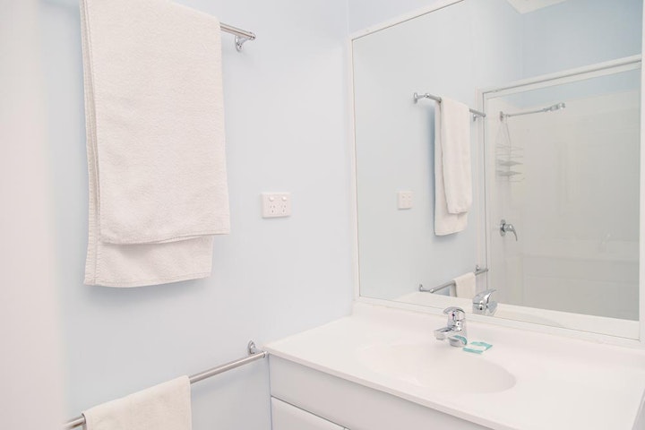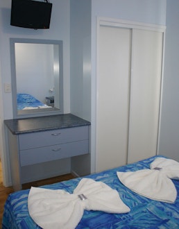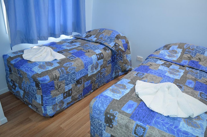 A very spacious unit with two separate bedrooms, a bathroom and its own veranda. There is a queen size bed and TV in the main bedroom, the second bedroom has two single beds. The open plan living area has a kitchen, dining & lounge area with TV, DVD, Foxtel and some units have a flip out sofa bed. These units have overhead fans and air-conditioning. Parking for one car is available beside the units.