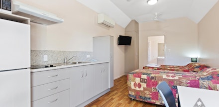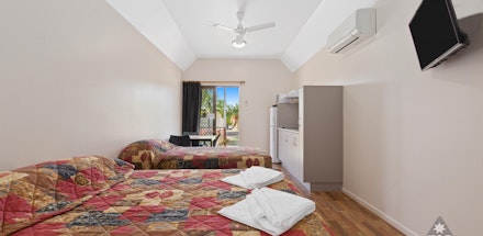 Our villas are fully self-contained open plan units with kitchen, veranda, air-conditioning, overhead fans and TV. All of the villas have a veranda with a double bed and single bed sleeping a Maximum of 3 people. Parking for one car is available beside the units. NO PETS Allowed. Please contact us by phone for Pet Friendly options.