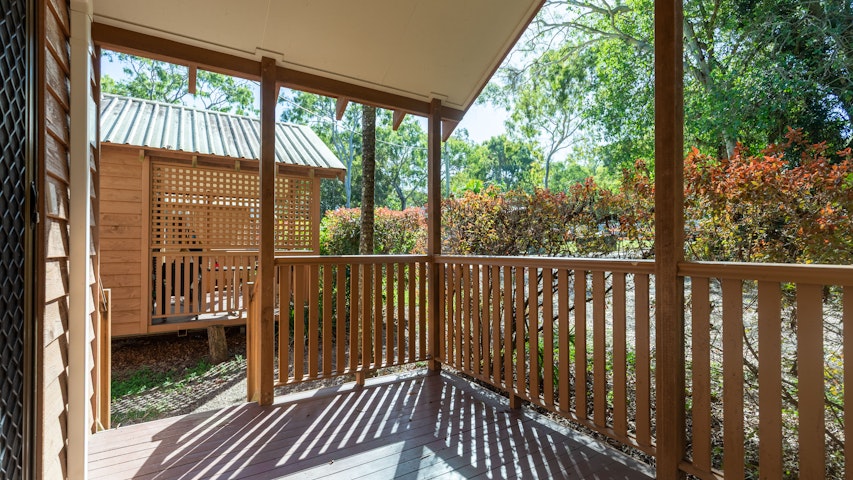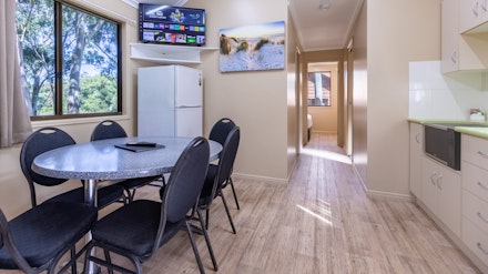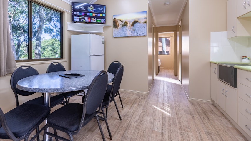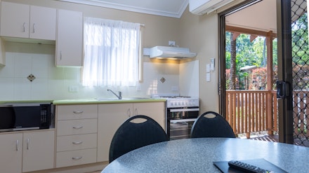 The largest of our cabins, the villas have a main bedroom with a queen bed and the second bedroom has two sets of bunk beds or a bunk bed with a double bed on the bottom and single on top. The villas have a bathroom with shower and toilet. The kitchen facilities include a small oven with stove-top, a microwave, jug, full size fridge and toaster to use. Crockery, cutlery and cooking implements are also in the cabins.