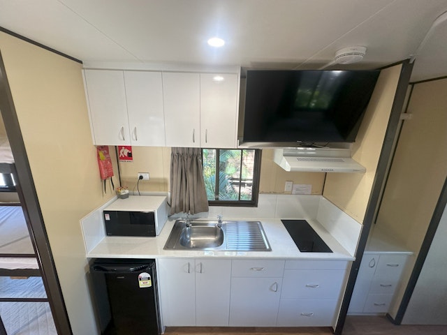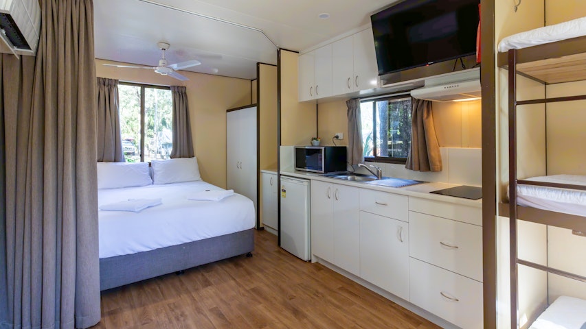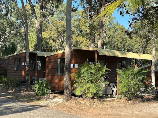 Our bungalows are the perfect family accommodation option in 1770, Queensland. Able to sleep a family of five or three single adults. They include a queen bed and triple bunks (designed for children) in an open-plan cabin. Kitchen facilities include an element to cook on, a microwave, jug, small bar fridge and toaster to use. Cutlery, crockery, and cooking implements are all provided in our bungalows. There is a reverse-cycle air conditioner, ceiling fan and a 40-inch smart TVs for your enjoyment. Please note there are no bathroom facilities in the bungalows, shared facilities are very close by for your use. Bungalows have a veranda with an outdoor setting.