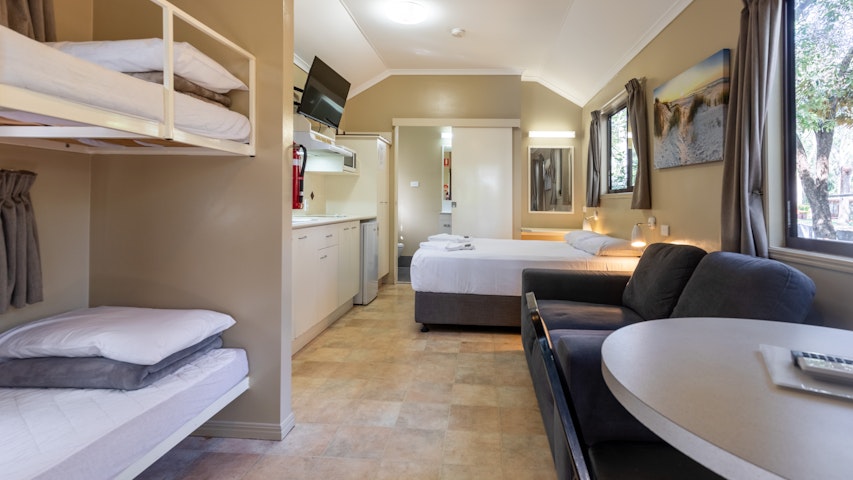 Are you looking for family accommodation in 1770? Our garden cabins sleep up to four people and are open plan with a view to the natural bush that surrounds the caravan park. The garden cabin has a queen bed and a set of bunk beds. The kitchen facilities include a twin stove-top with a microwave, jug, small bar fridge and a toaster with crockery, cutlery and cooking implements also provided. There is a 40-inch smart TVs for your enjoyment. A bathroom with shower and toilet is in the garden cabin. A ceiling fan and reverse-cycle air conditioning is in the garden cabin for your comfort. Garden cabins have an outdoor setting to enjoy the view.