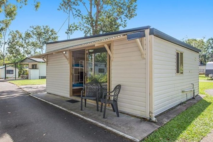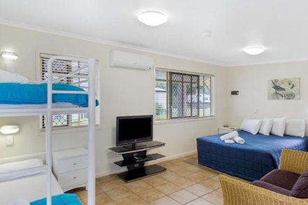 Ideal for couples or small families, this open-plan studio cabin sleeps up to four guests with a queen bed and single bunks. It features a convenient kitchenette, air conditioning, and a comfortable living area with TV. A great base to relax after a day of exploring, with all essentials close at hand.