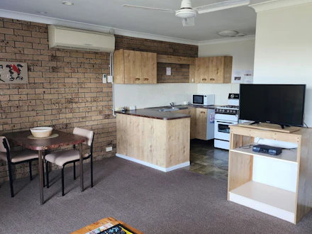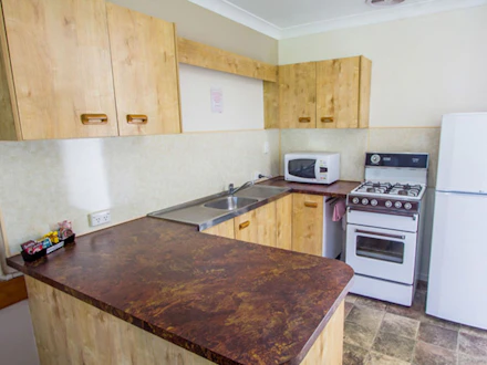 Ideal for families or small groups, this spacious one-bedroom unit sleeps up to five with a queen bed, two singles, and a trundle. Enjoy a full kitchen with gas oven, stovetop, microwave, and full-size fridge. The air-conditioned living area features a dining space and TV for relaxed nights in. Clean & comfortable, it’s a practical base for your stay in Toowoomba.