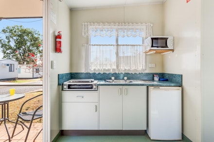 The kitchenette is equipped with an under-bench fridge, kettle, toaster, microwave, and a two-burner electric cooktop, perfect for preparing light meals or snacks.