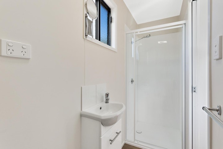 The kitchenette is fully equipped with a full-sized fridge/freezer, kettle, toaster, microwave, and a four-burner electric cooktop, giving you all the essentials for preparing meals or snacks. Enjoy your meals at the indoor dining table or take them outside to the outdoor seating area for a breath of fresh air.