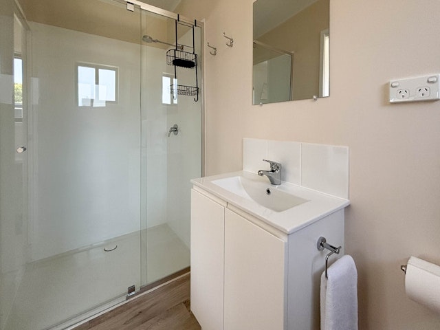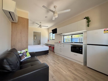 You will also find a dining area, comfortable sofa, smart TV, reverse cycle air conditioning and an iron. Step outside onto your private deck with outdoor seating and peaceful views across the park, with your own parking space right outside the cabin. The ensuite bathroom includes a walk in shower, vanity, toilet and hair dryer, with everything you need for a comfortable stay.