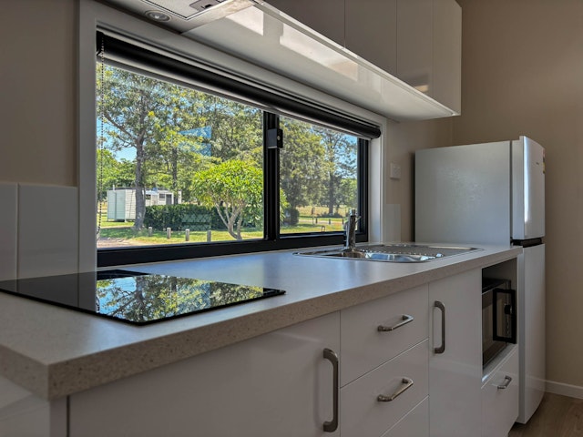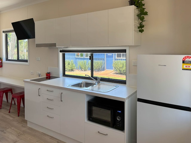 The cabin features a queen bed with fresh linen and towels provided, so you can arrive, settle in and unwind straight away. The open plan layout includes a well equipped kitchenette with an electric two burner cooktop and range hood, full sized fridge freezer, microwave, kettle and toaster, along with plenty of bench space and storage.