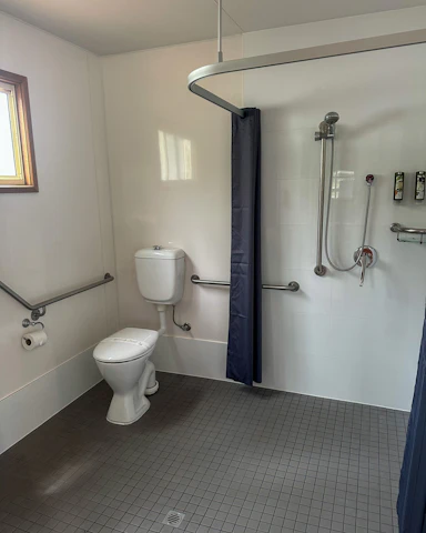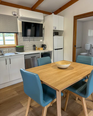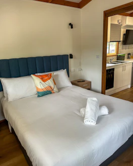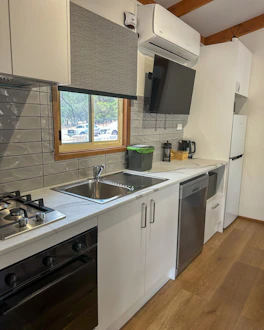Dog friendly and accessible. This cottage has 2 bedrooms, and sleeps a total of 4. It features a large disability-accommodating bathroom, and toilet with a seat in the shower. One bedroom has a queen bed with an electric blanket, and the other bedroom has a set of 2 bunk beds. The separate living and kitchen area includes seating, microwave, cook top, reverse cycle air-conditioning and TV.