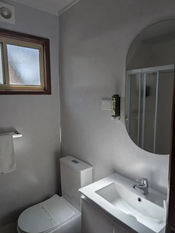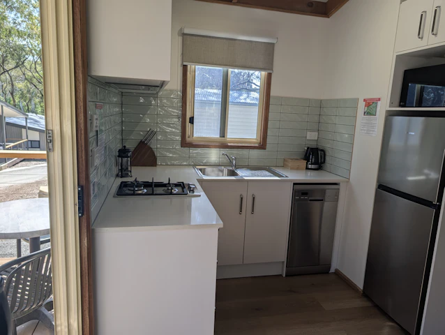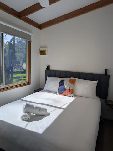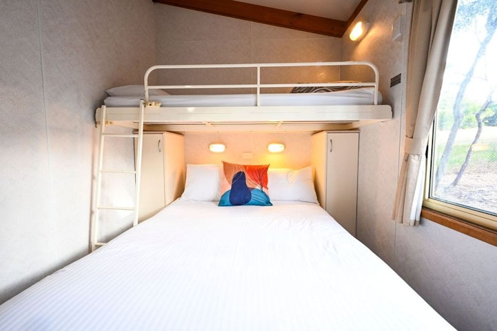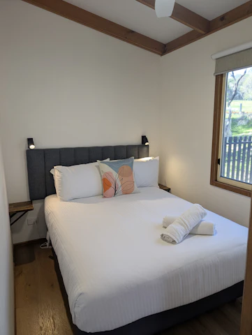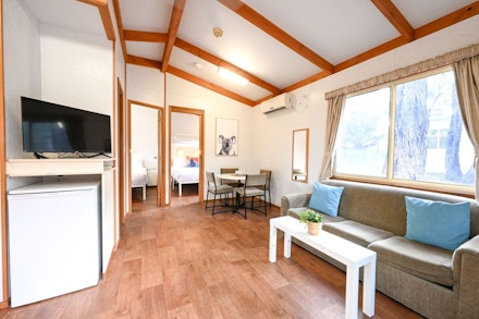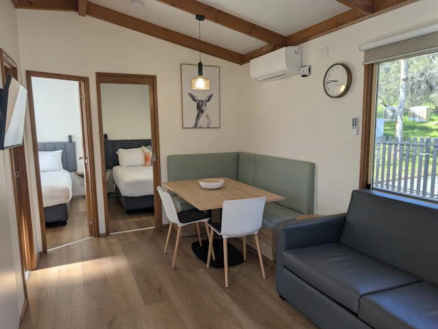 Sleeps 5 with a bathroom and 2 bedrooms. One bedroom includes a queen bed with an electric blanket, and the other bedroom has a double bed with an electric blanket, with a single bunk over the top. Seperate living and kitchen area includes seating, microwave, cook top and grill, reverse cycle air-conditioning and TV.