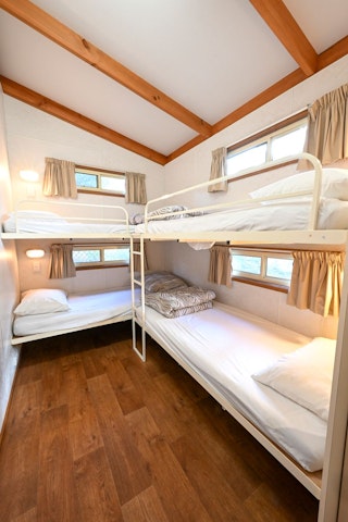 This cottage sleeps 6, with one bedroom including a queen sized bed with an electric blanket, as well as another bedroom with 2 sets of double bunks. Separate living and kitchen area includes seating, microwave, cook top and grill, reverse cycle air-conditioning and TV.