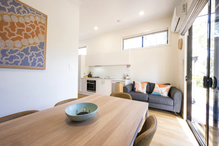 The main queen bed with electric blanket, sits (divided by a wall) within the main living area with a bathroom coming off of this room also. There is a separate bedroom at the end of the cabin containing 2 sets of bunk beds. Living and kitchen area includes seating, microwave, gas cook top, reverse cycle air-conditioning and TV.