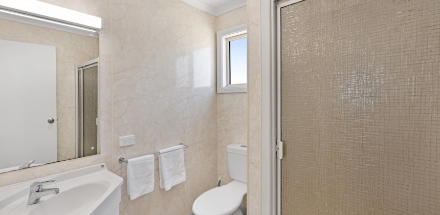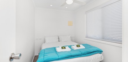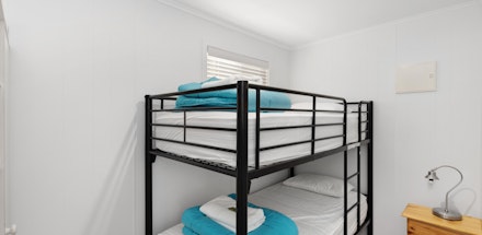 This accommodation features a main double bedroom with a double bed and a second bedroom with a set of bunk beds. It includes a fully equipped kitchen, an ensuite shower and toilet, and a dining table with chairs. For comfort, there is air-conditioning and heating, along with a TV. Linen is supplied for all beds.