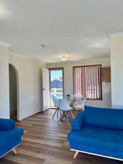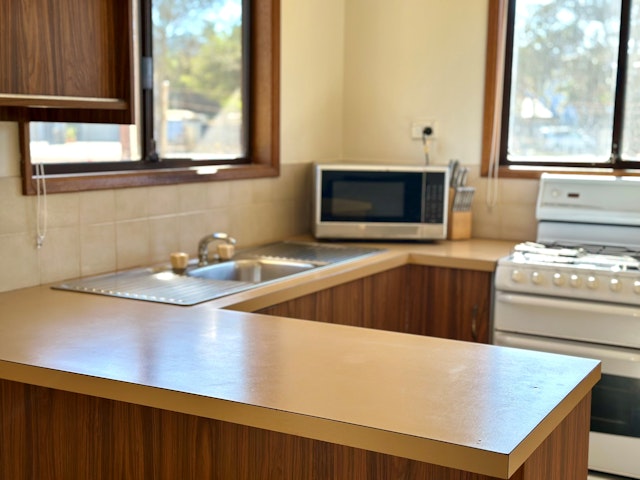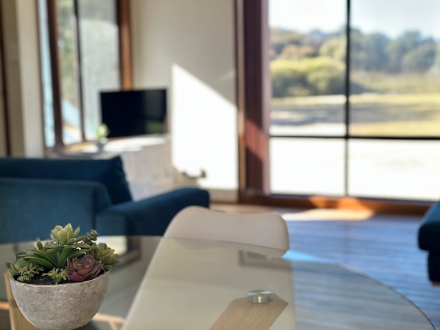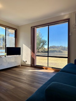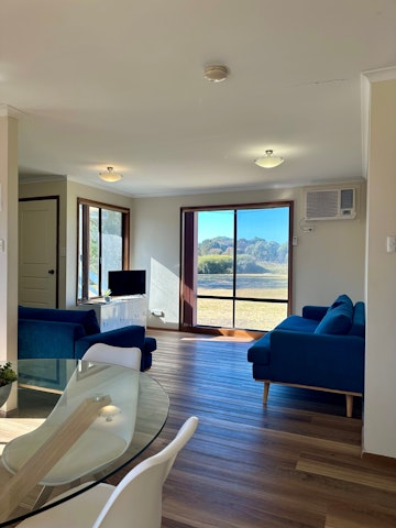 This holiday house, which sleeps 6, features a fully equipped kitchen with an oven and a dining table with chairs. It includes an ensuite shower and toilet, and a comfortable lounge area. For your comfort, there is air-conditioning and heating in the main living area, as well as a TV.